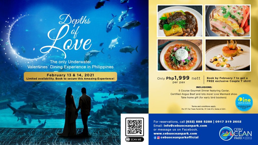 or calling: (032) 888 5288, +63 917 319 2602. Learn more: https://www.cebuoceanpark.com/vday or https://www.copaquadining.com.